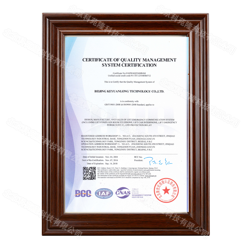 公司通過國家ISO9001:2000國際質量管理體系資格認證和美國聯(lián)合技術公司全球Q+級供應商審核,產品通過國家強制性3C認證和美國UL認證,是世界范圍內多家大型電梯公司的指定供應商與戰(zhàn)略合作伙伴。